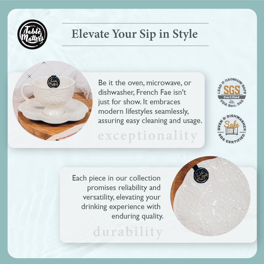 Benefits? The French Fae collection assures not just visual delight but unparalleled practicality. Savour peace of mind knowing they’re Lead and cadmium-free. prioritising your drink’s safety. They’re versatile companions. too. suitable for the Oven. Dishwasher. and Microwave. Crafted with precision. this ceramic beauty promises durability. making it an enduring addition to your Collection.