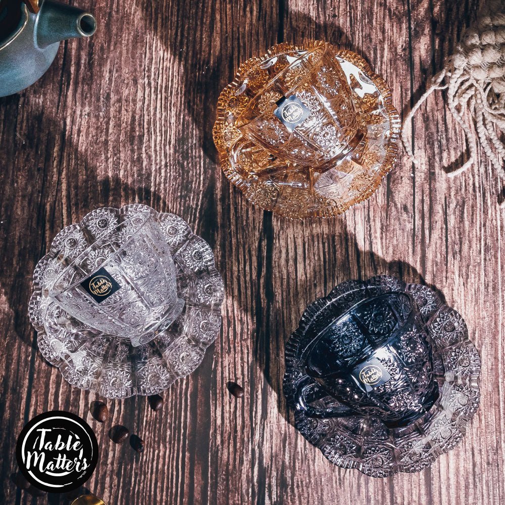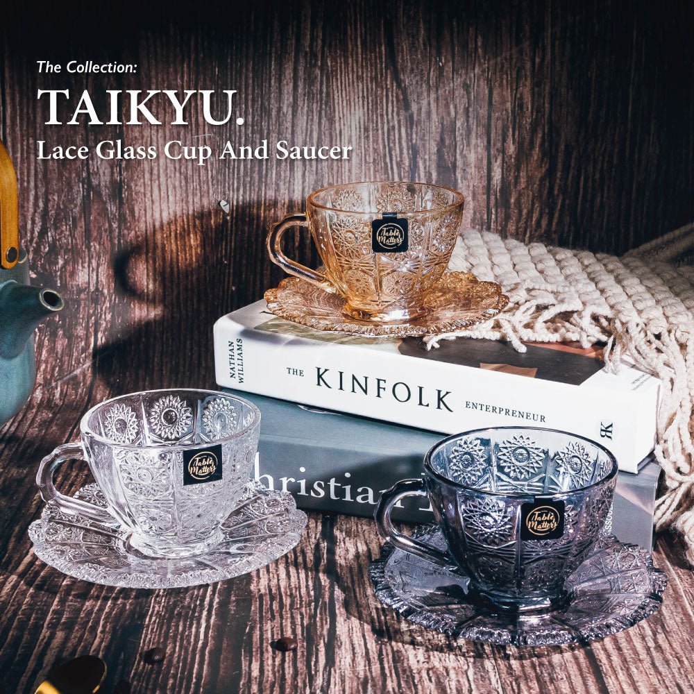 A glass fit for a queen. The TAIKYU lace Glass Cup and Saucer proves that royalty knows no status. Laced with detailed flowers and a flower-shaped saucer. this collection is perfect for reminiscing childhood days of having magical Hi-tea sessions with your friends. Our Taikyu Collection which features a series of durable glassware. Made with high quality and lead-free glass that provides a safer user experience.