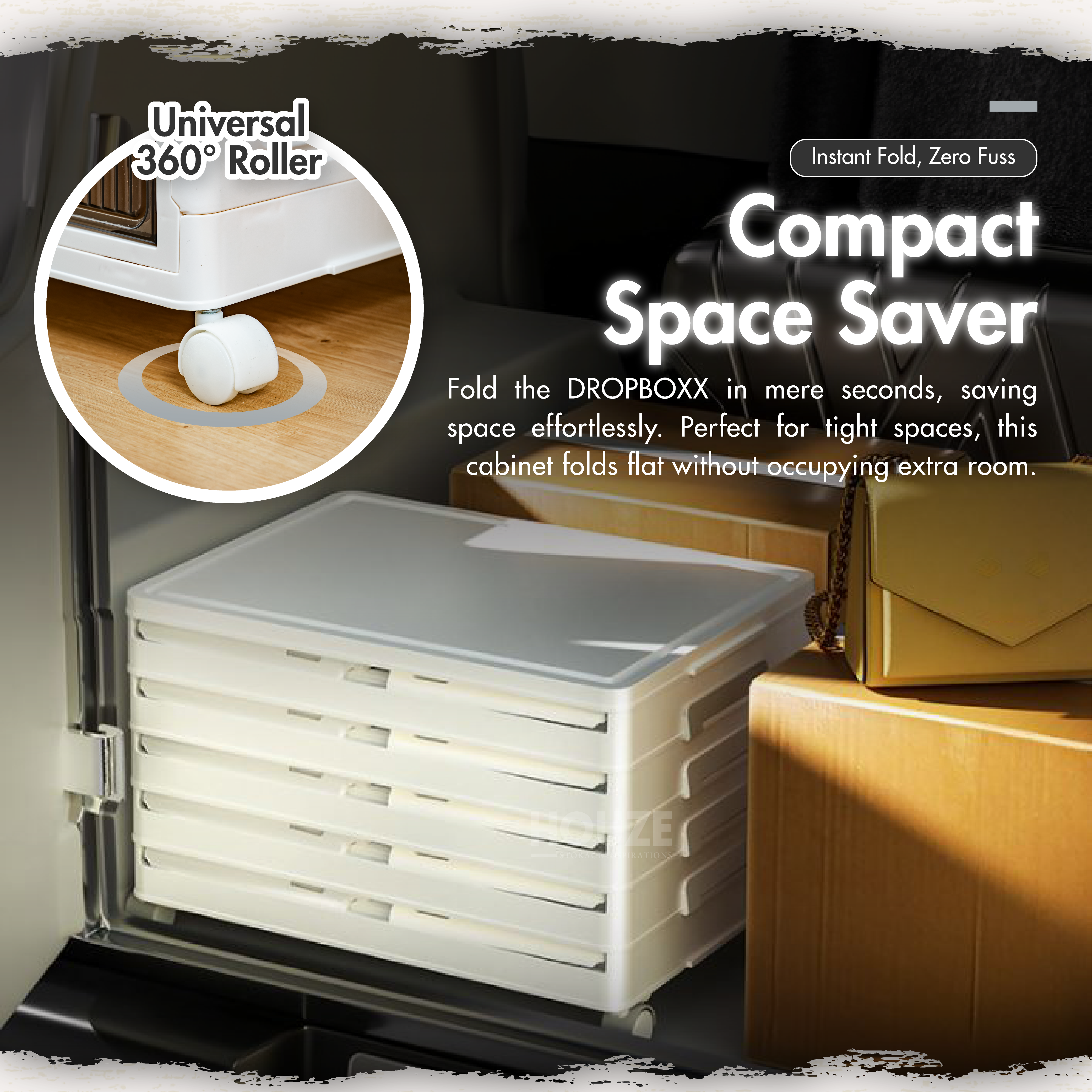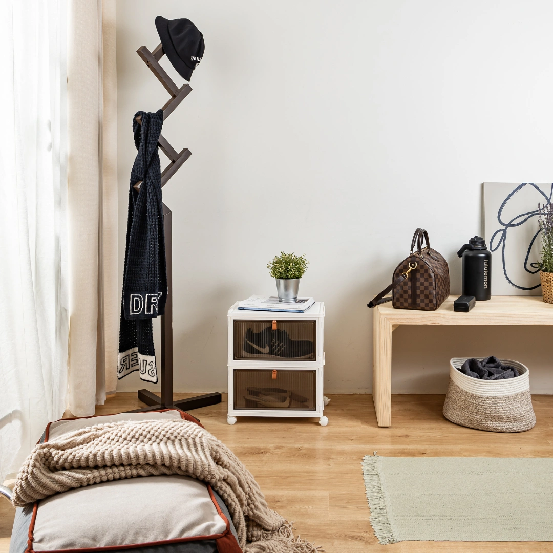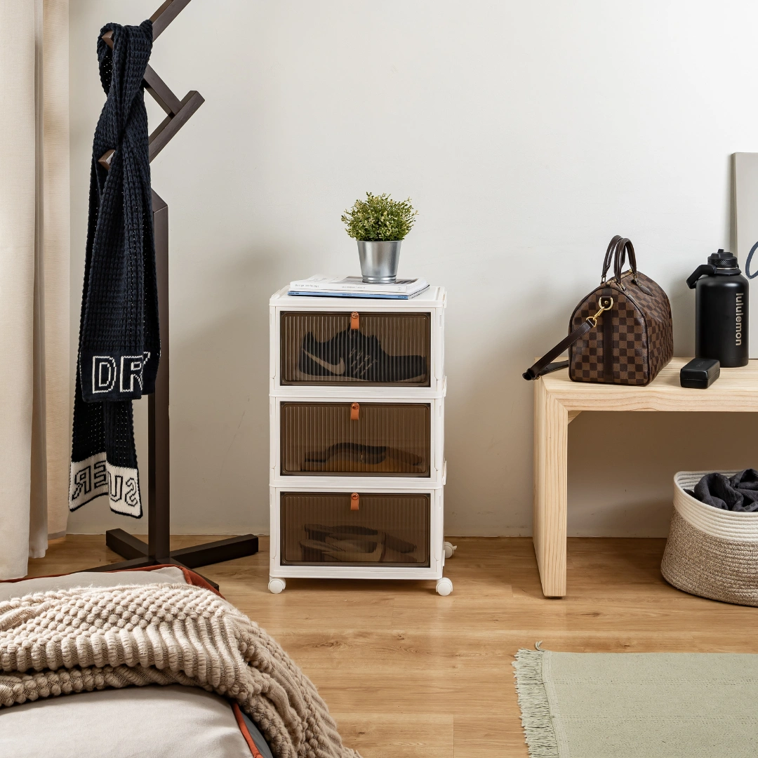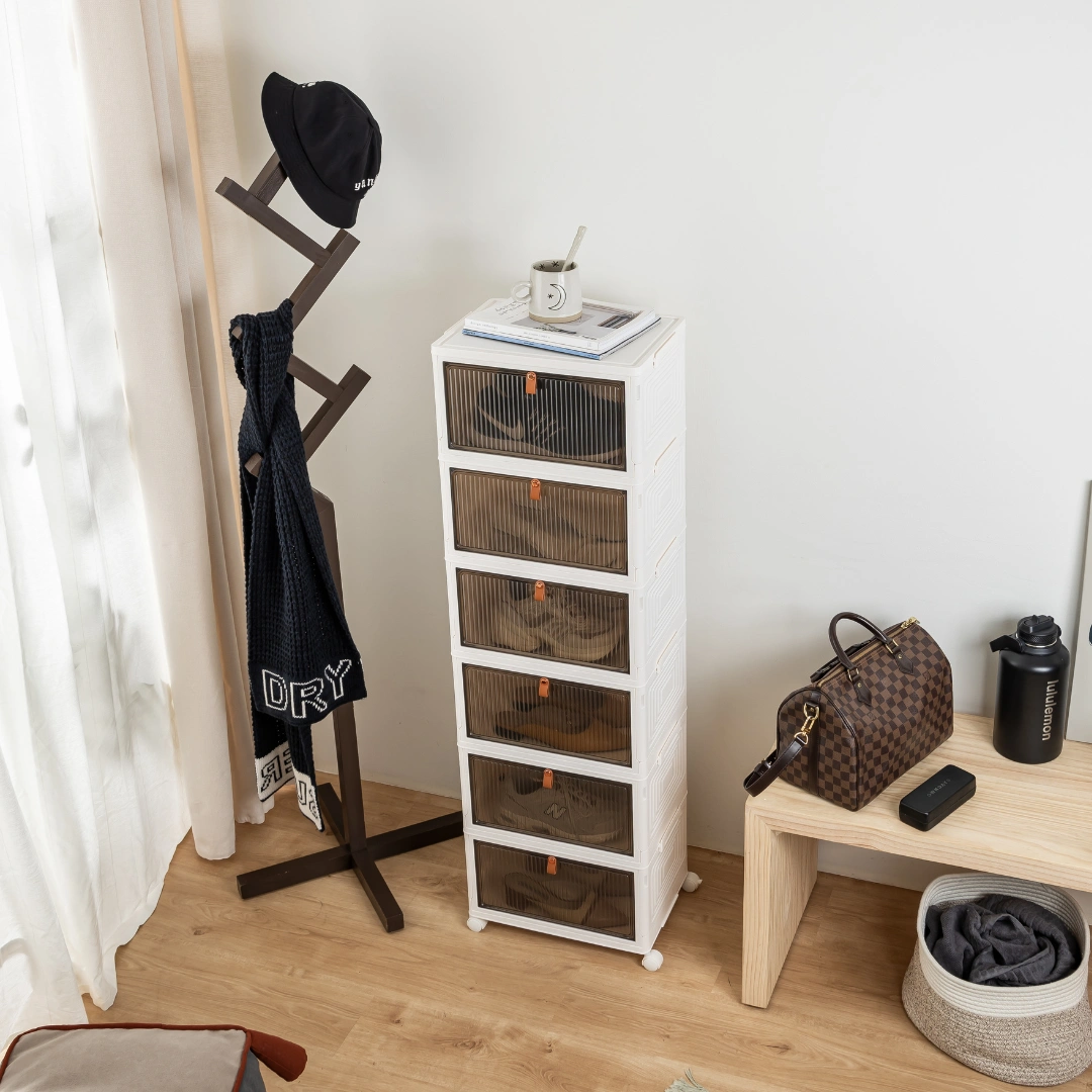 Discover the HOUZE DROPBOXX. your ideal shoe storage solution! Compact and foldable. this single or multi-tier cabinet is made from durable materials. keeping your shoes safe from dust and moisture. Its magnetic latch and semi-transparent door make it a breeze to use. Plus. its wheels make moving around easy. Perfect for any modern Singapore home. the SoleMate is stylish and practical!