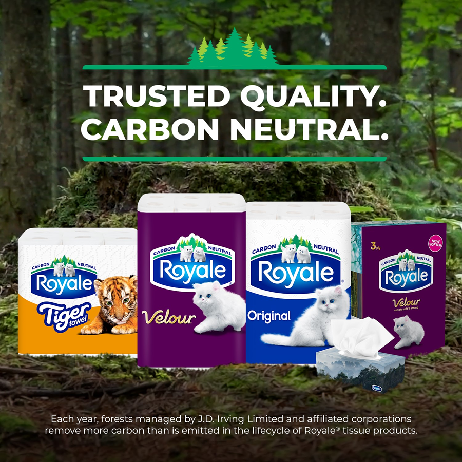 - Royale Tissue Products are Carbon Neutral. Each year, forests we manage remove more carbon than is emitted in the lifecycle of Royale tissue products. For more information please visit www.Royale/carbon-neutral.com